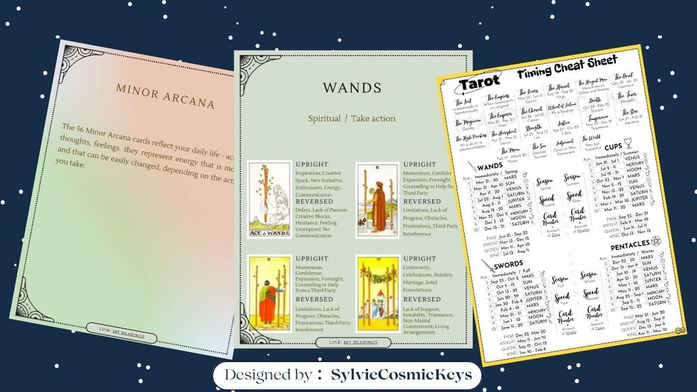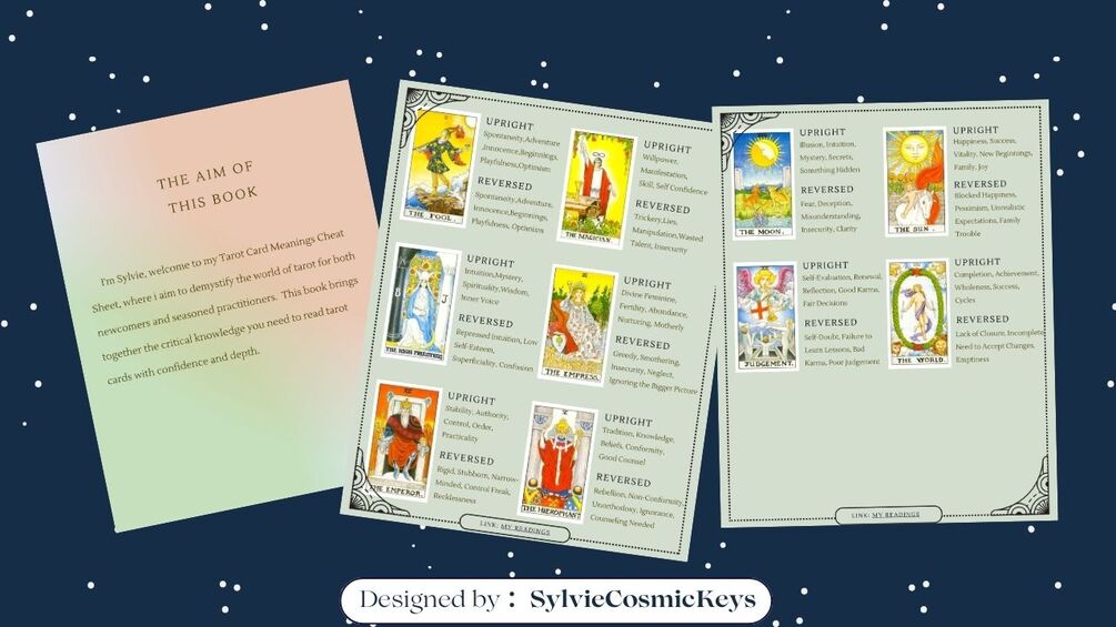 This beautifully designed Tarot Cheat Sheet includes upright and reversed meanings for all 78 cards (Major Arcana & Minor Arcana – Wands, Cups, Swords, Pentacles).
